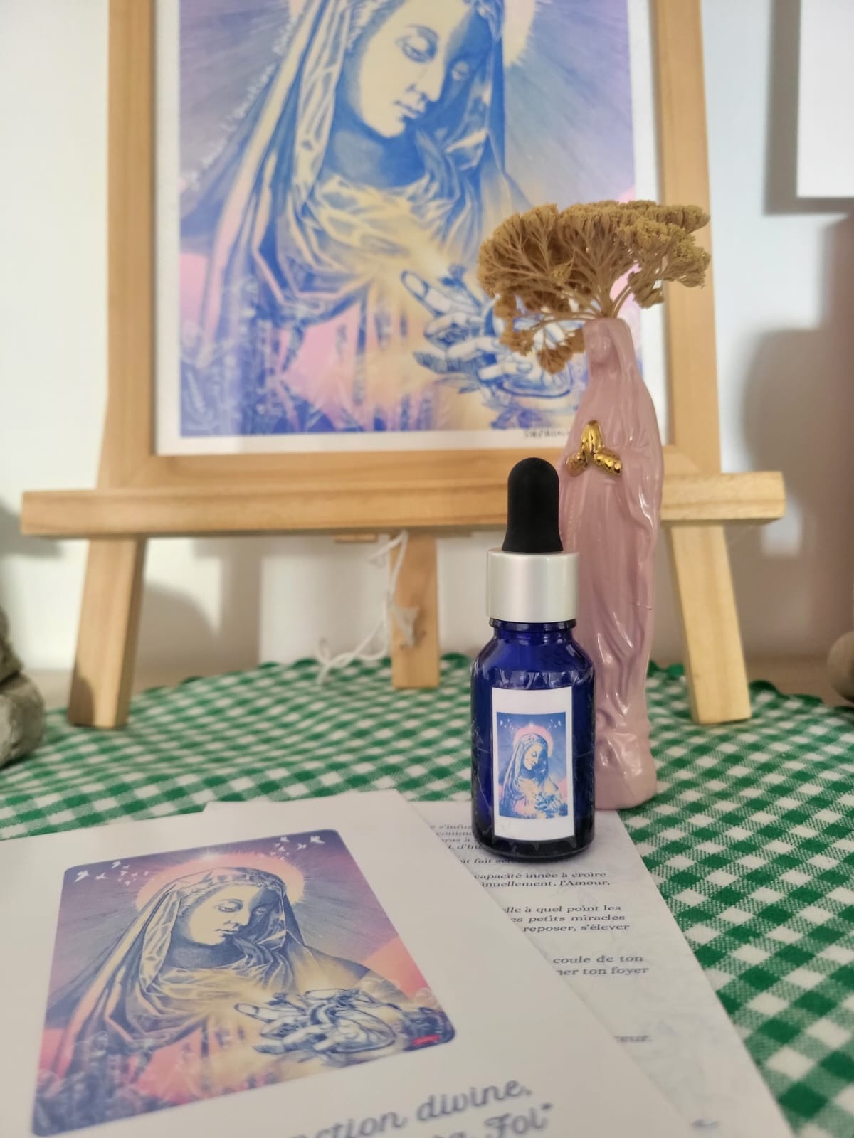 D’où vient-elle ? L’huile miraculeuse a été reçue par une femme pieuse et miraculée plusieurs fois. À son réveil, suite à la visite de Jésus et Marie, de l’huile était présente à son chevet. L’huile a ensuite été examinée et analysée en échantillon dans un laboratoire comme étant totalement Vierge.